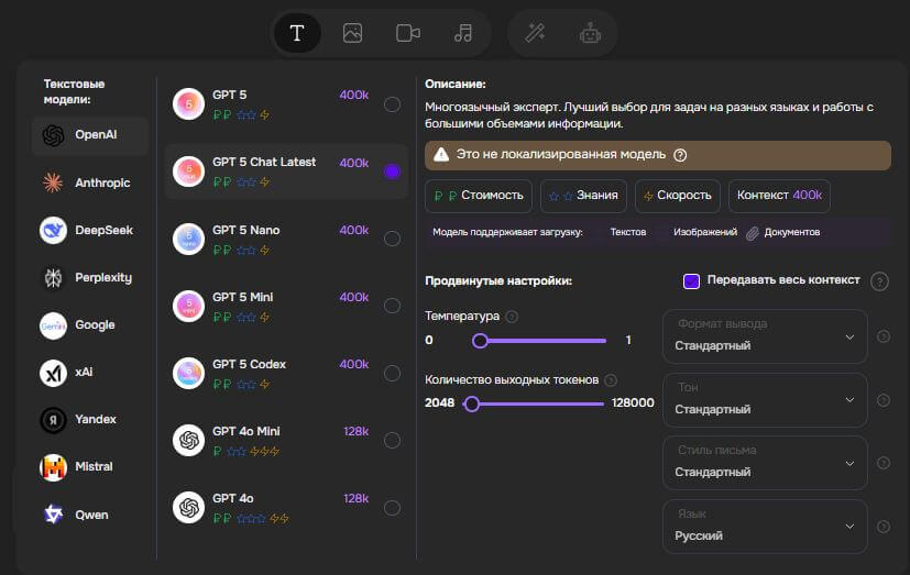 Кроме ChatGPT-4, GPT-5 и GPT-5 Chat Latest, доступны Claude, Gemini, YandexGPT, DeepSeek и десятки специализированных моделей. Выбирайте оптимальный инструмент для каждой задачи.