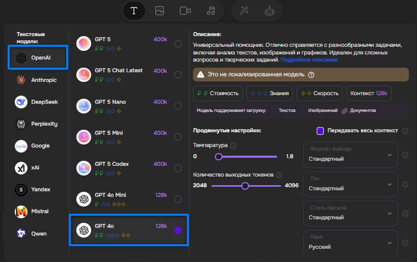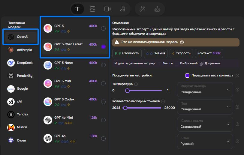 GPT-5 — самая продвинутая модель на сегодня. Она умеет глубоко рассуждать, решать задачи с нуля, проверять себя на каждом шаге. Особенно сильна в программировании, математике, аналитике. Обрабатывает до 400 000 токенов контекста — это примерно 300 000 слов или целая книга.