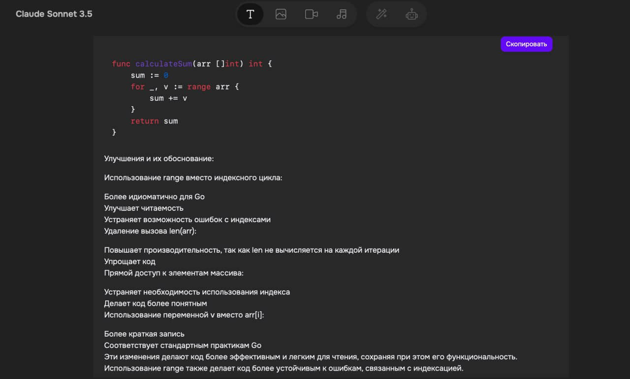 Промпт: проверь этот фрагмент кода на Go и предложи улучшения по скорости и читаемости. Объясни кратко, почему твой вариант предпочтительнее.