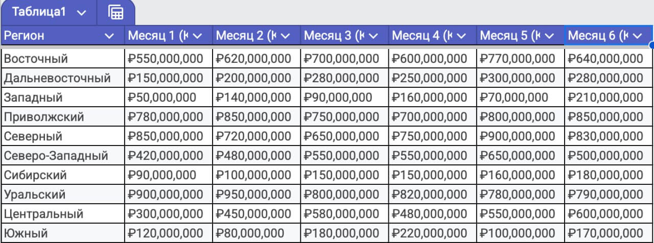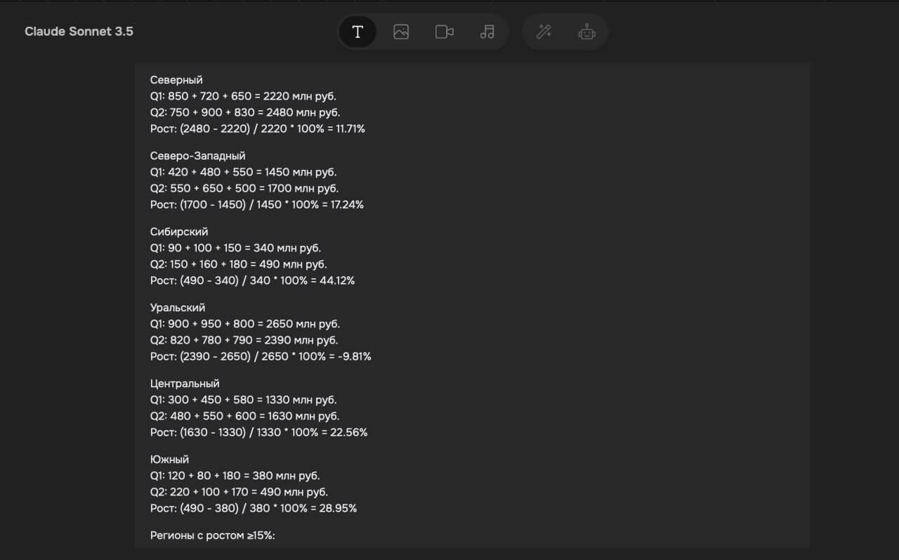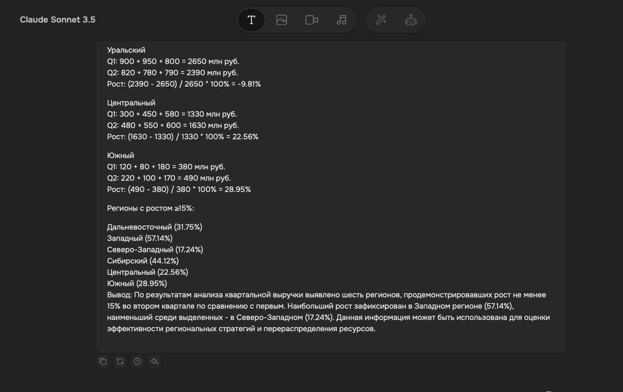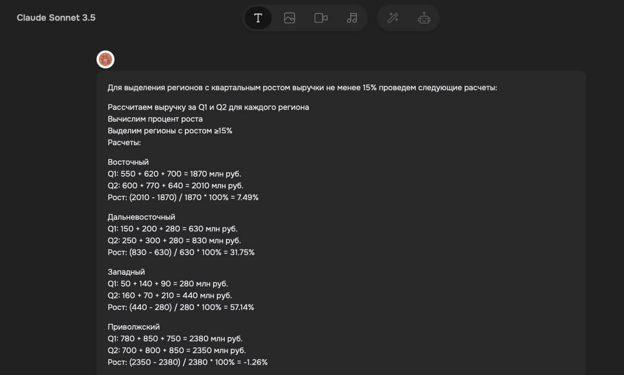 Промпт: у нас есть таблица с выручкой по регионам. Выделите регионы, в которых квартальный рост выручки (Q2 по сравнению с Q1) составил не менее 15%. Сформулируй краткий вывод в деловом стиле.