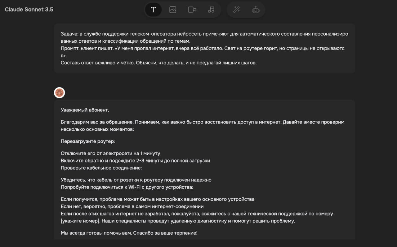 Промпт: клиент пишет: «У меня пропал интернет, вчера всё работало. Свет на роутере горит, но страницы не открываются».