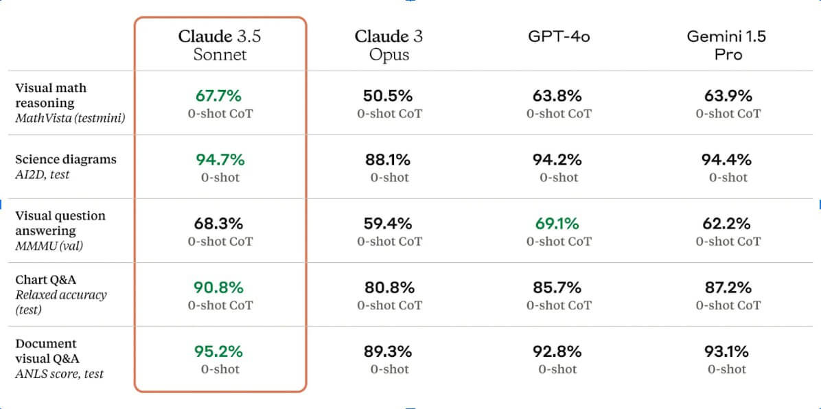 - Знания университетского уровня (Undergraduate level knowledge): в бенчмарке MMLU Pro модель от Anthropic также лидирует с 78.0%, обходя Gemini 1.5 Pro (75.8%).