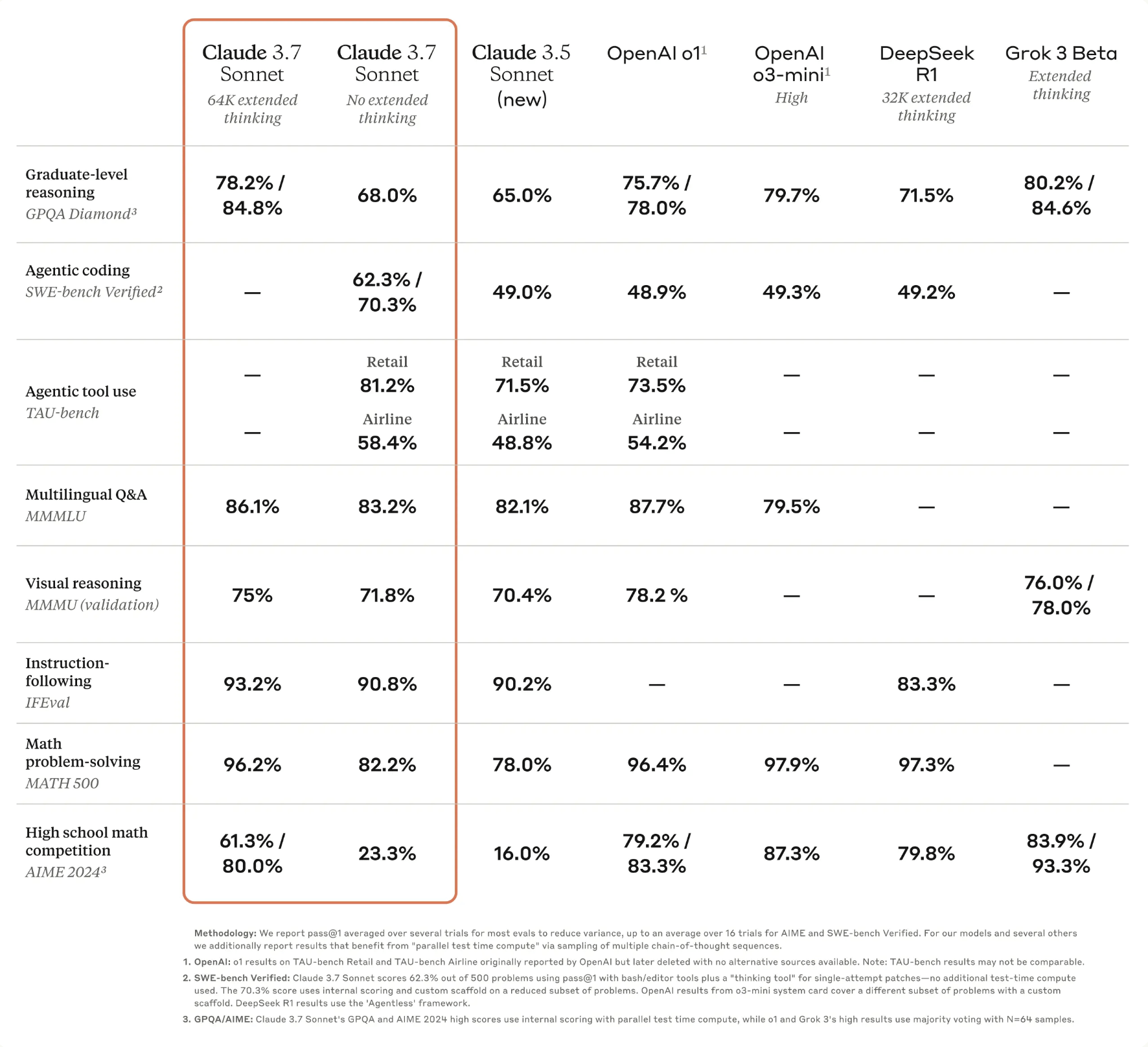 Claude 3.7 Sonnet имеет два режима: стандартный и расширенный (Extended thinking), поэтому в таблице приведены оба результата. В ключевых выводах мы используем показатели расширенного режима, так как именно он отражает максимальные аналитические возможности модели. . Однако в таблице отсутствует значение в режиме расширенного рассуждения для Agentic coding и Agentic tool use, поэтому в выводе используется результат стандартного режима.