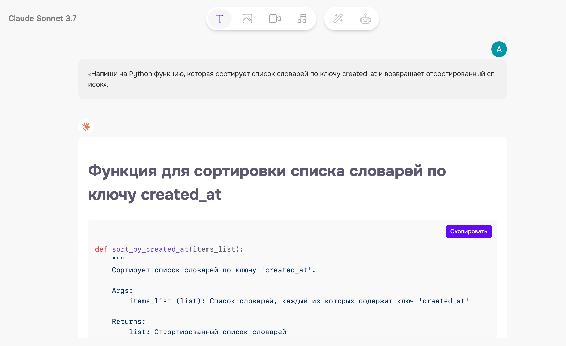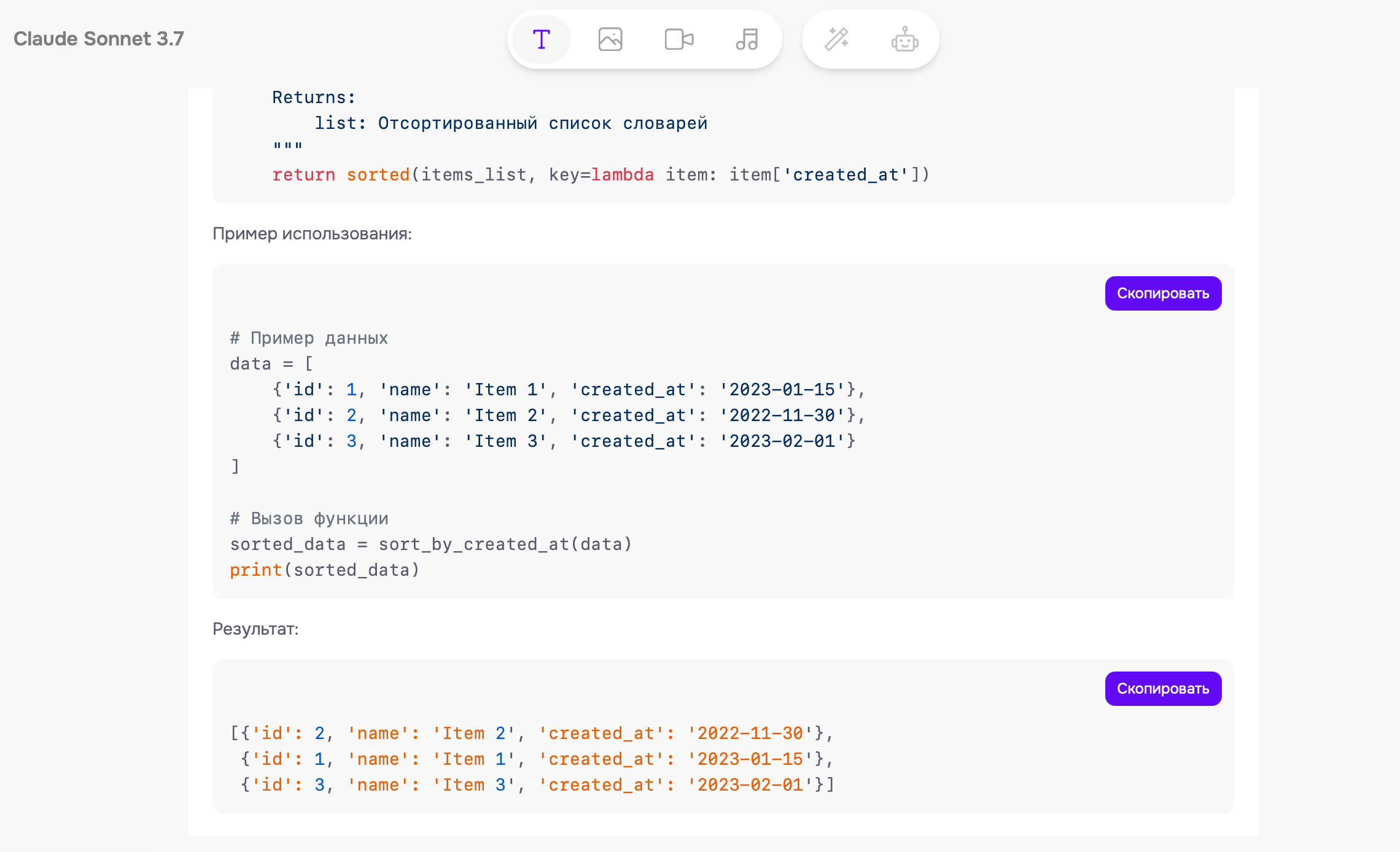 Промпт: «Напиши на Python функцию. Она должна сортировать список словарей по ключу created_at. И затем возвращать отсортированный список».