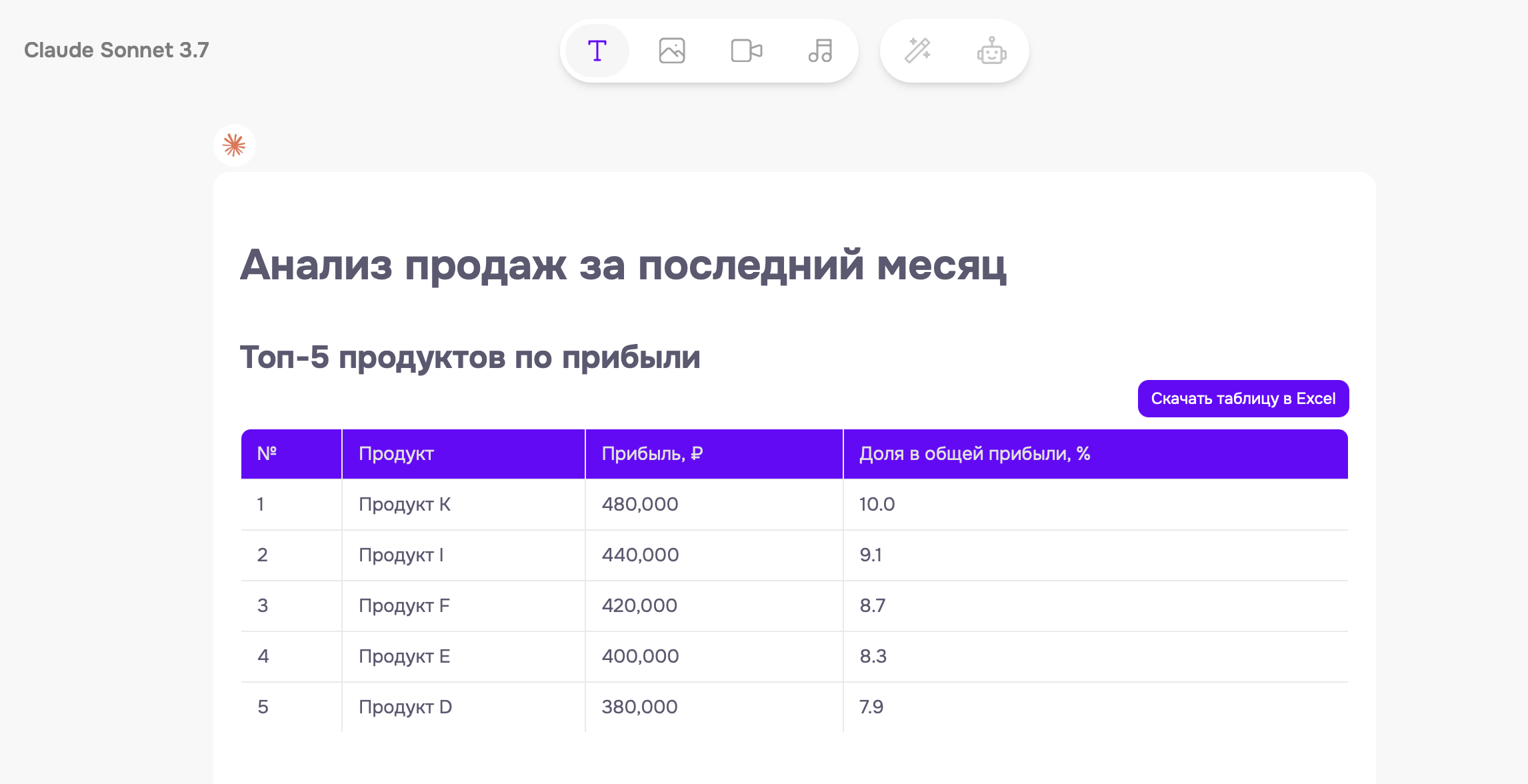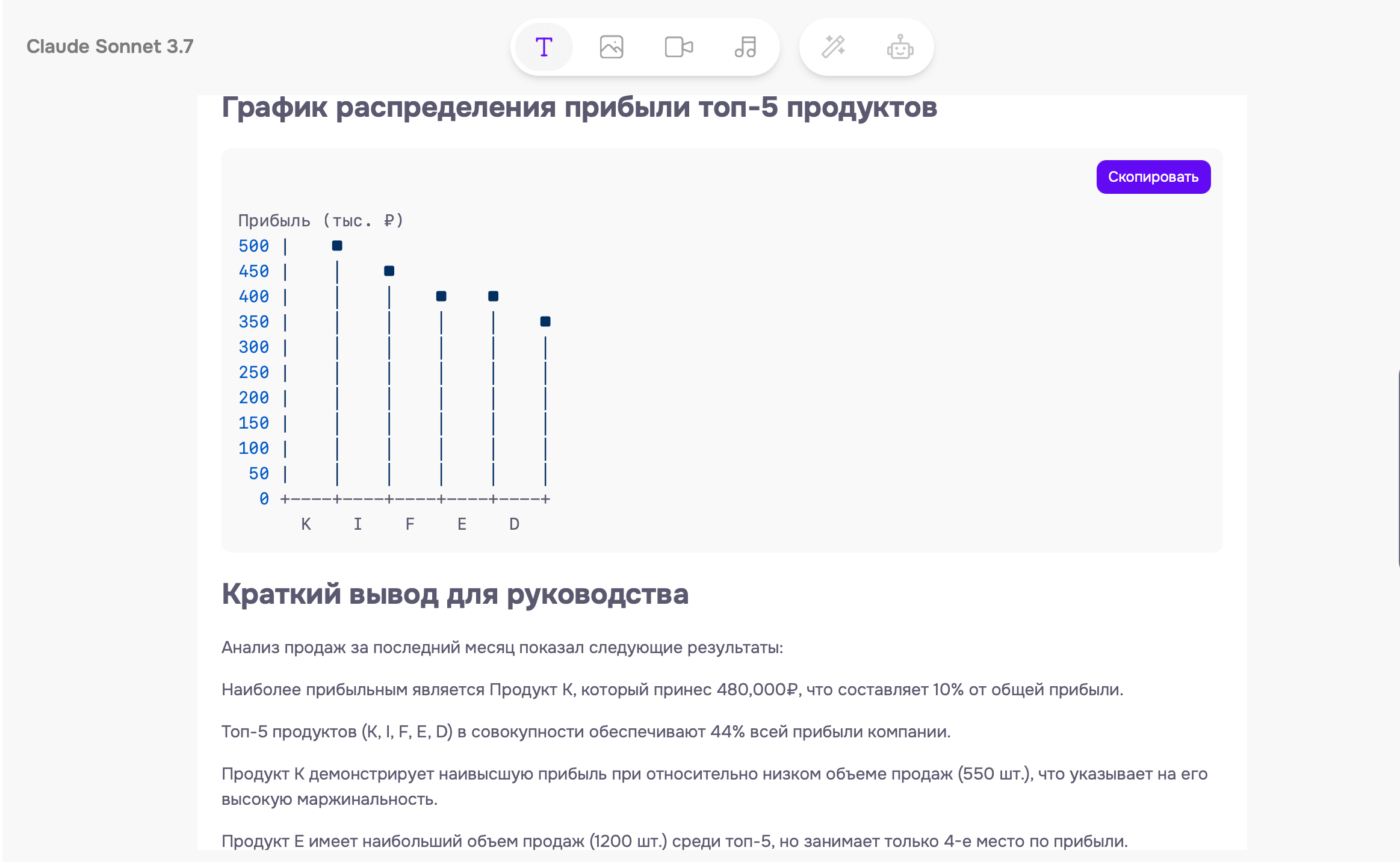 Промпт: «Проанализируй таблицу с данными о продажах за последний месяц. Выведи топ-5 продуктов по прибыли. Затем создай график распределения прибыли. И подготовь краткий вывод для отчёта руководству».