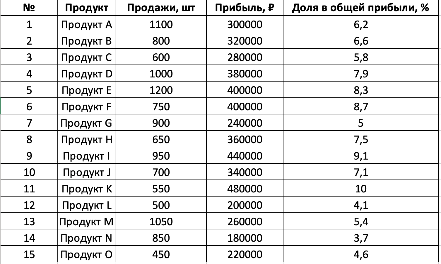 Задача: аналитику необходимо понять, какие продукты приносят наибольшую прибыль за месяц. Таблица с данными может быть большой, с множеством категорий и строк. Нужно быстро получить топ-5 продуктов. А также нужно краткое пояснение для руководства.