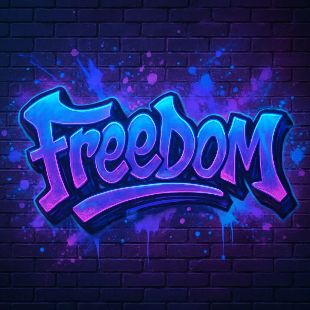 Промпт: «Граффити слово "Freedom" в уличном стиле: объемные буквы с неоновой подсветкой, фон из кирпичной стены с брызгами краски, фиолетовые и синие оттенки, динамичная композиция».