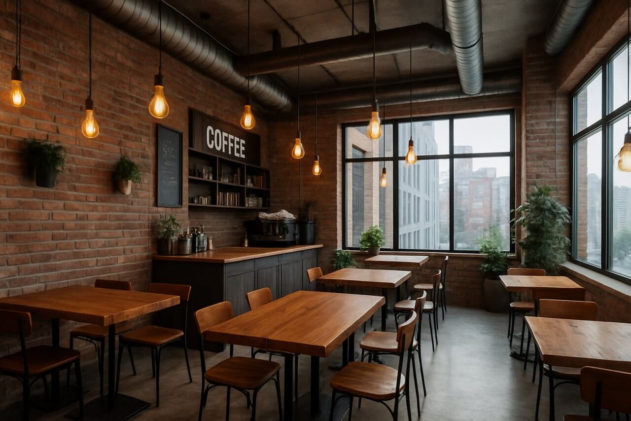 Промпт: «Интерьер кофейни в лофт-стиле: кирпичные стены, деревянные столы из слэбов, подвесные Edison лампы, открытые вентиляционные трубы, зелень в горшках, панорамные окна с видом на город».