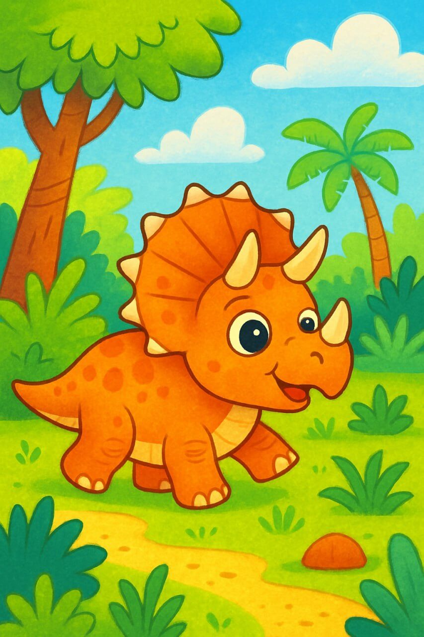Промпт: «Милый детский рисунок: трицератопс с большими дружелюбными глазами играет в доисторическом лесу, яркие цвета, мультяшный стиль, подходит для книги дошкольников».