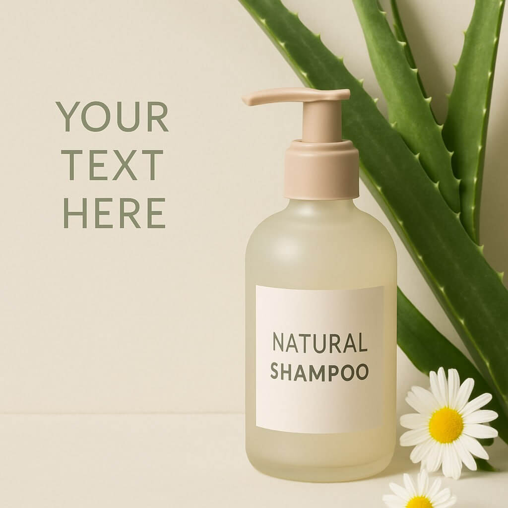 Промпт: «Рекламный баннер для натурального шампуня: флакон из матового стекла на фоне свежих листьев алоэ и цветов ромашки, пастельные тона, естественное освещение, минималистичный стиль, место для текста слева».