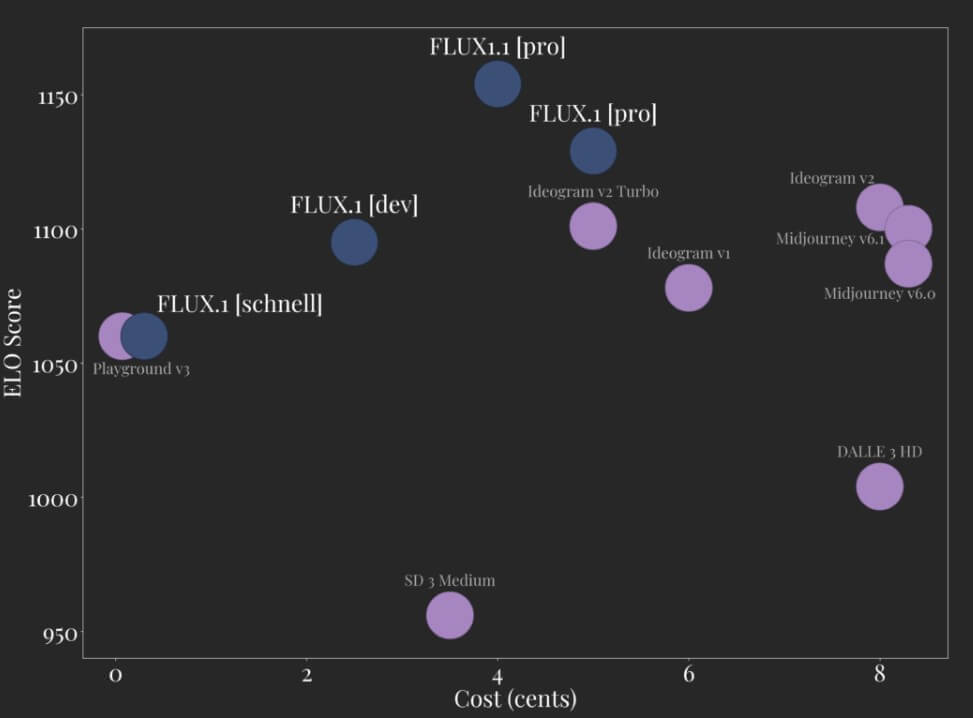 - Отрыв от аналогов. Модели бюджетного сегмента, такие как SD 3 Medium, стоят сопоставимо (около 3,5 центов). Однако их качество (ELO ~950) значительно уступает версии 1.1 pro.