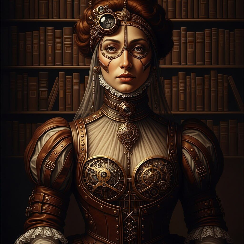 Промпт: «Концептуальный портрет персонажа, стимпанк-библиотекарь. На ней детальное викторианское платье из латуни и кожи, с небольшими видимыми механическими часовыми частями под тонким слоем ткани. Лицо с нежными, похожими на ренессанс чертами. Мастерская текстура масляной живописи, драматическое освещение кьяроскуро, глубокая палитра цветов сепии и меди. В стиле смешения художников Здислава Бексинского и Г. Р. Гигера.»