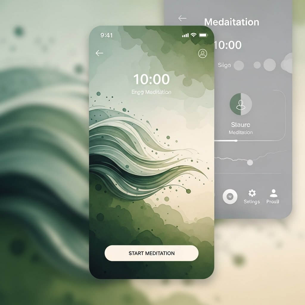 Задача: команда разработчиков приложения для медитаций хочет протестировать визуальный стиль интерфейса. Нужно быстро создать рендеринг экрана, который будет сочетать минимализм и ощущение спокойствия/природы.