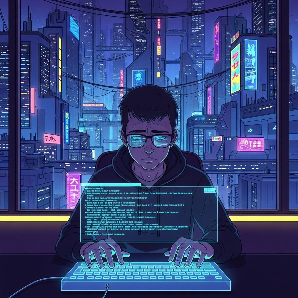 Промпт: «Яркая цифровая иллюстрация, лоу-фай эстетика. Молодой человек сидит в неоновой комнате, работая за голографической клавиатурой, с кодом, отражающимся в его очках. Вид на киберпанк-город через окно. Преобладают темно-синие, пурпурные и электрические желтые акценты. Высокая насыщенность, чистые линии.»