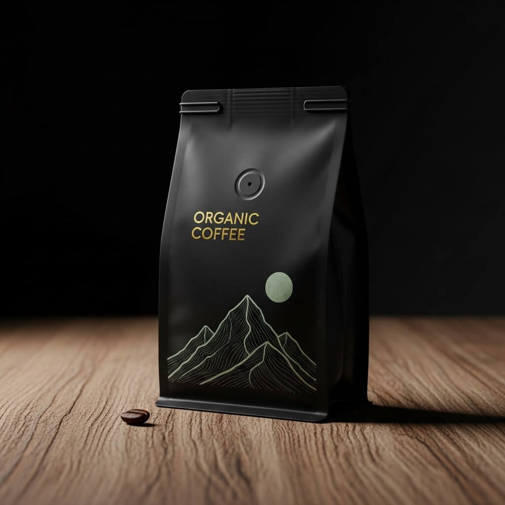 Проммт: «Фотореалистичный рендер минималистичного макета пакета кофе для органического бренда, стоящего на текстурированном деревянном столе рядом с одним кофейным зерном. Упаковка матовая черная с тонкими надписями золотой фольгой и содержит нарисованную от руки иллюстрацию абстрактного горного хребта в мягких зеленых тонах. Драматическое студийное освещение, малая глубина резкости, высокая детализация.»