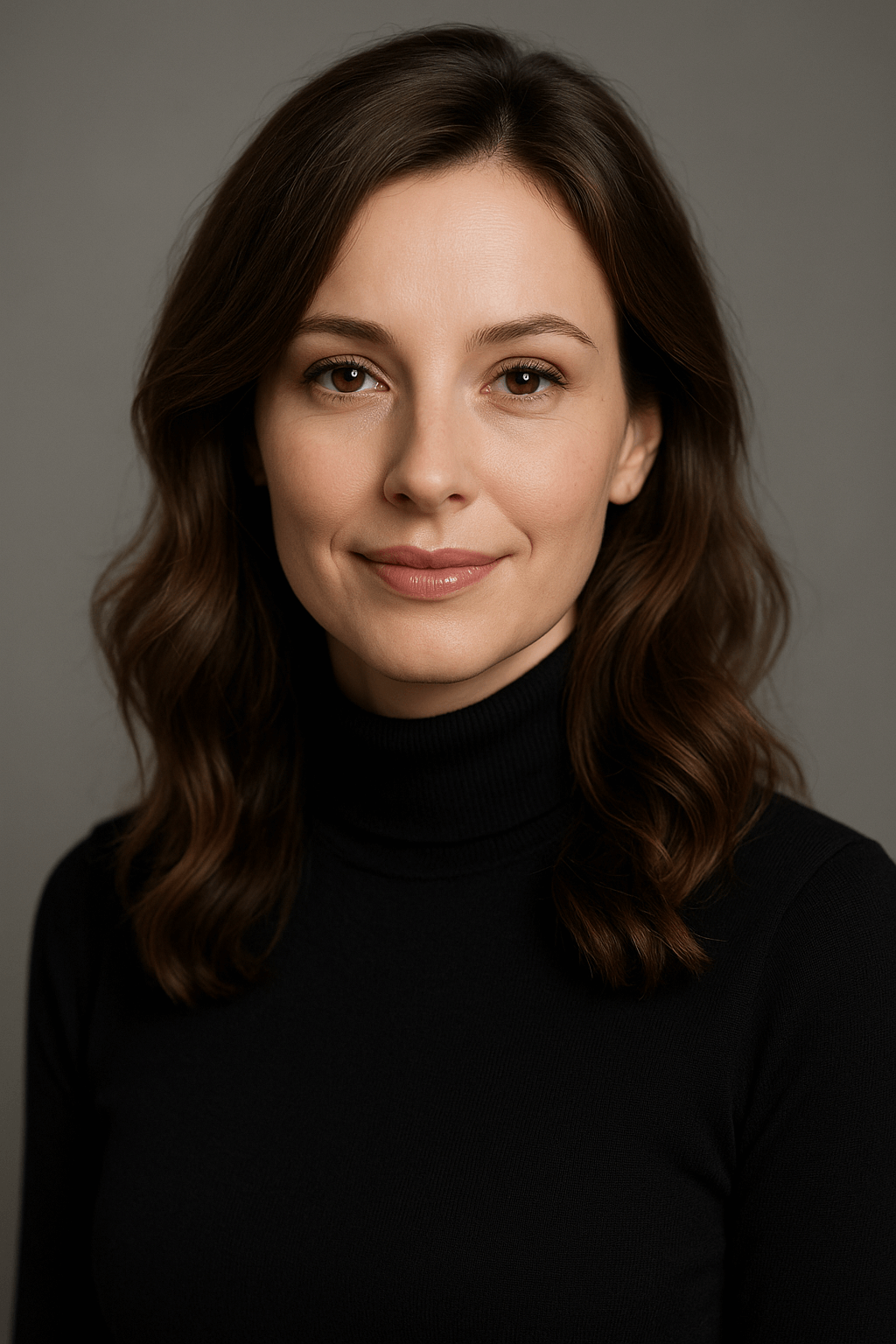 Professional studio portrait of elegant woman in her 30s, gentle smile, direct eye contact, natural makeup, hair styled in soft waves, wearing black turtleneck, neutral gray background, soft beauty lighting with fill light, shot with 85mm f/1.4 lens, shallow depth of field, photorealistic, high resolution, professional photography