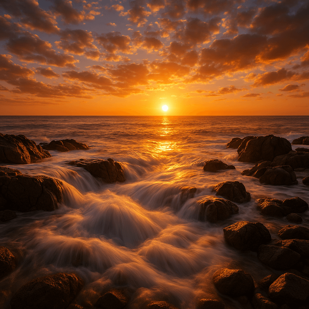 Seascape at golden hour, waves crashing on rocky shore, sun setting over horizon creating golden path on water, dramatic sky with scattered clouds, long exposure for silky smooth water effect, shot with wide angle lens, vibrant warm colors, landscape photography masterpiece, 8K detail