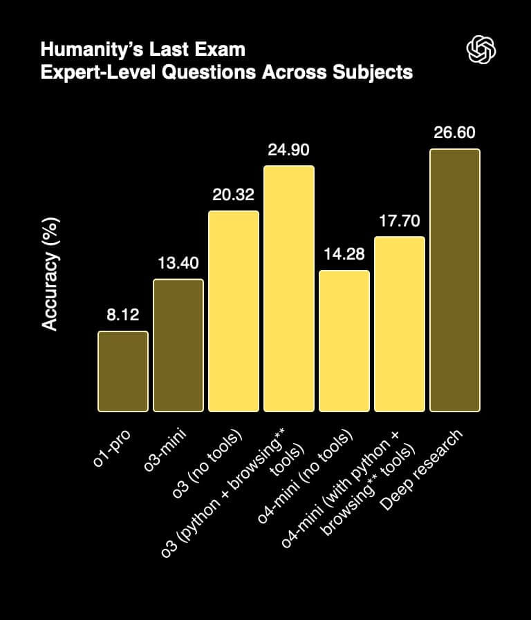 Представленный график под названием «Последний экзамен человечества» (Humanity’s Last Exam) демонстрирует результаты решения экспертных задач из разных областей знаний.