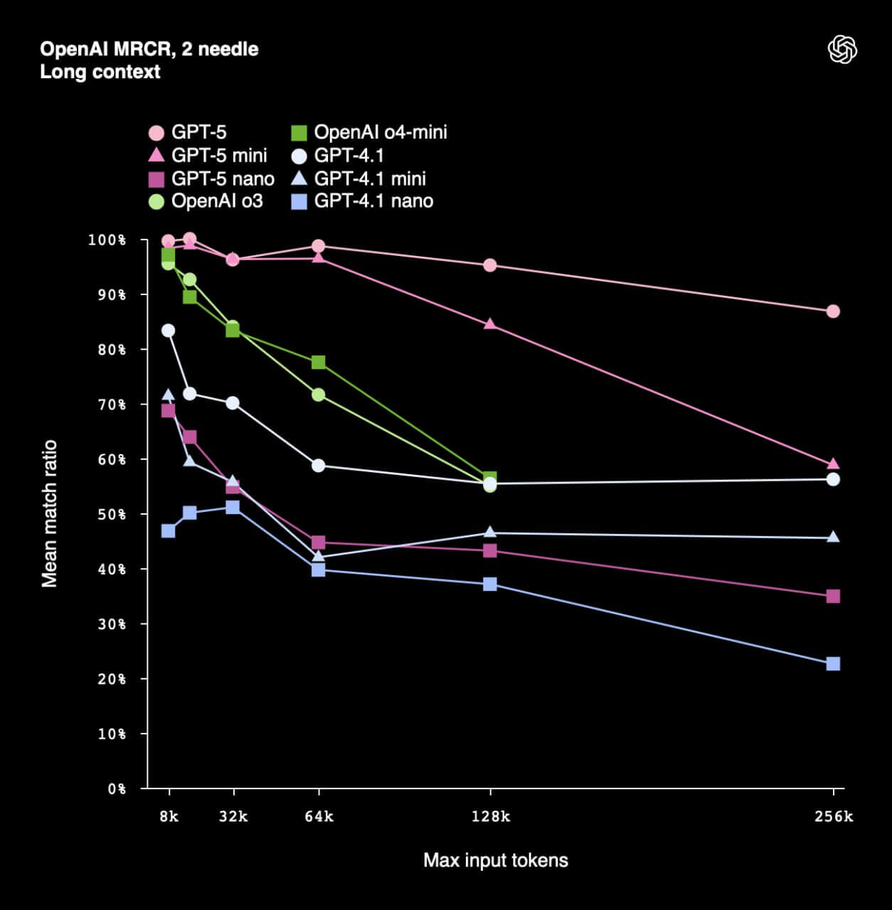 Однако модель закономерно уступает флагманским решениям нового поколения — семейству GPT-5 (nano, mini, full). Разрыв в среднем коэффициенте совпадения (Mean Match Ratio) становится более выраженным с увеличением объема контекста. На 256k токенах разница в эффективности между 4o mini и самой малой из моделей GPT-5 (nano) становится статистически значимой, что подчеркивает преимущества новой архитектуры GPT-5 в задачах экстремально длинного контекста.