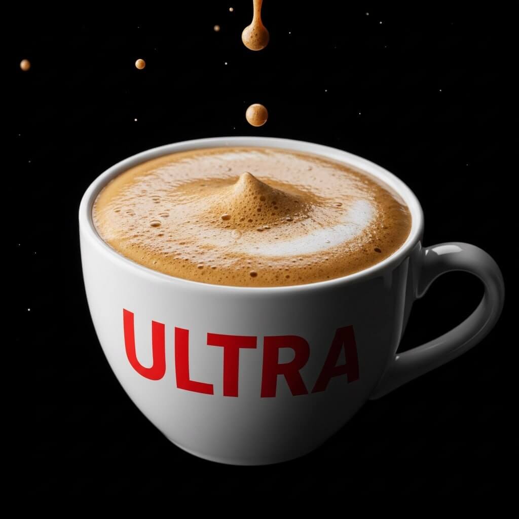 Промпт: «Крупный план парящей чашки кофе в стиле высококлассной рекламной фотографии в студии. Должна быть густая кремовая пенка и эффект замороженного движения. На боку чашки напишите текст „ULTRA” красным шрифтом без засечек. Освещение нужно драматическое, на чёрном фоне. Требуется высокий фотореализм. Изображение в формате 1:1.»