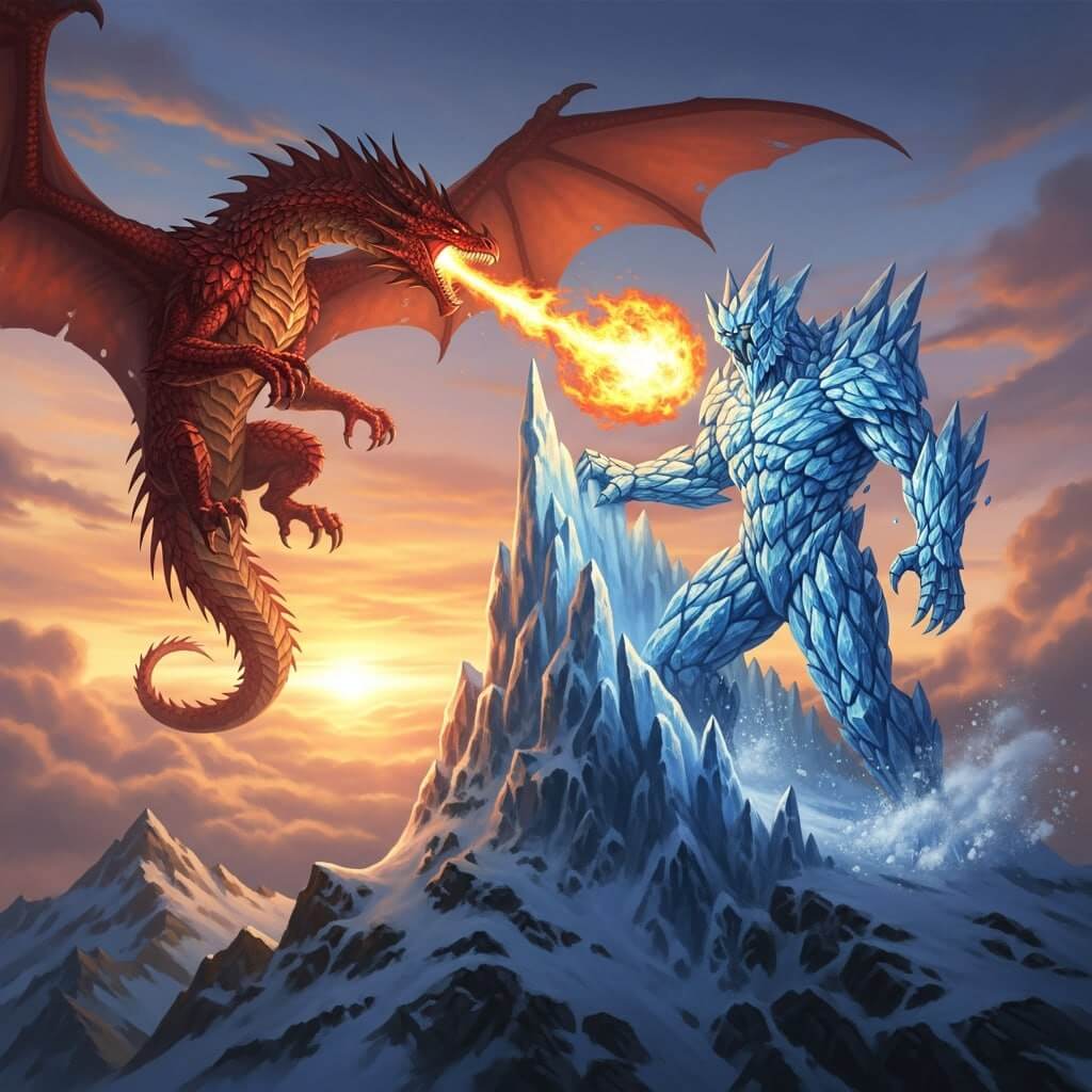 Промпт: «Эпическая битва между Огненным Драконом и Ледяным Гигантом на вершине снежной горы на закате. Детализация должна быть ультравысокой, стиль — классический фэнтези-арт. Дракон выдыхает пламя, Гигант создает ледяную стену. Фокус на текстуре чешуи и льда. Требуется разрешение 2К.»