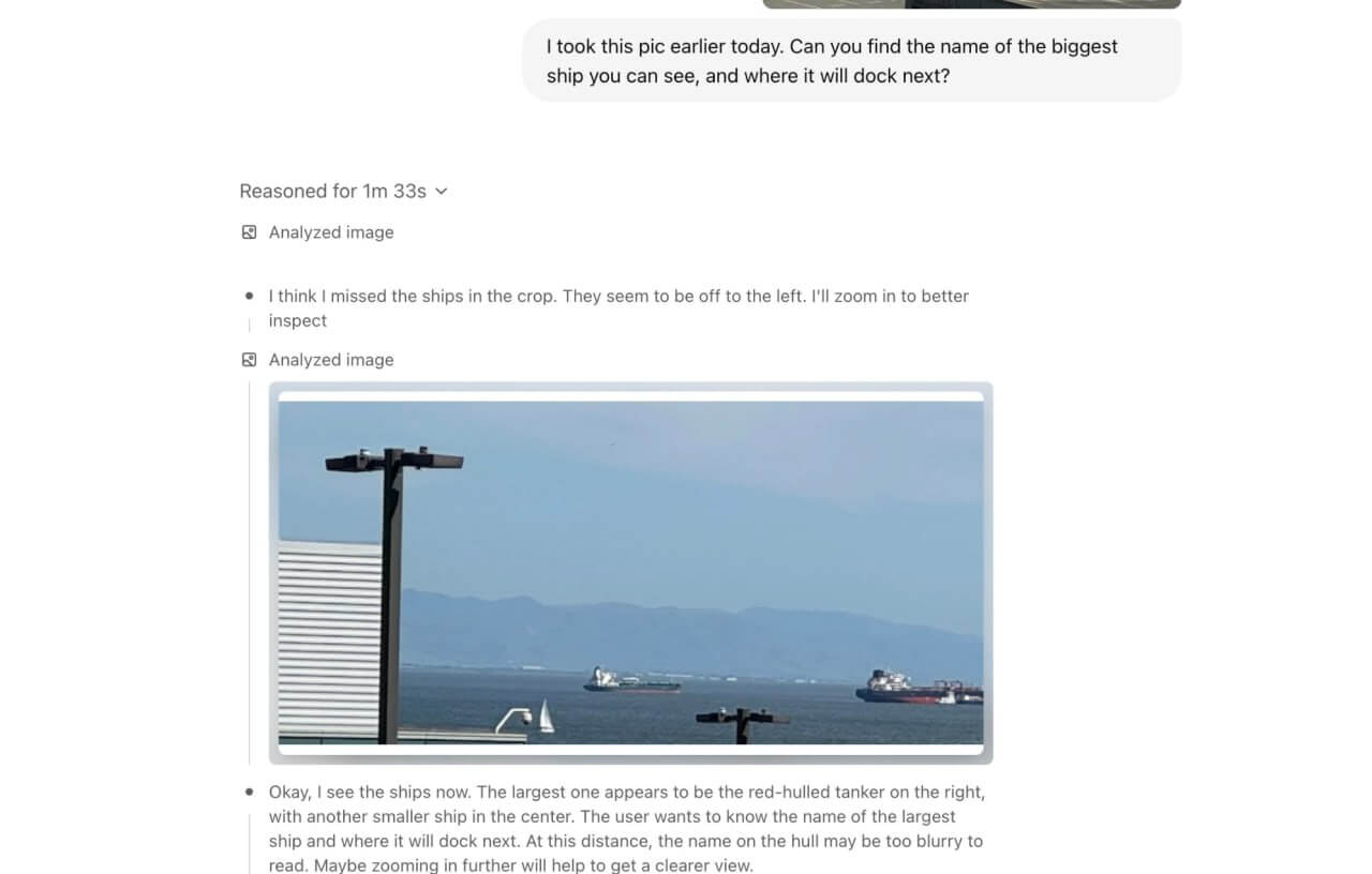 - Контекстуальное понимание: O3-Pro не только анализирует визуальные данные, но и учитывает конечную цель запроса — определение имени судна и его следующего порта назначения