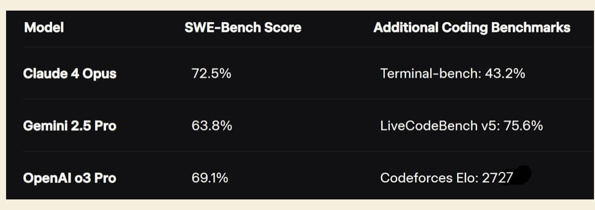 - Claude 4 Opus доминирует в решении комплексных задач из реальной практики (SWE-bench: 72.5%), что подтверждает его репутацию инструмента для сложных рефакторингов и работы с большими кодобазами. Его способность сохранять консистентность на протяжении многочасовых сессий делает его незаменимым для enterprise-разработки.