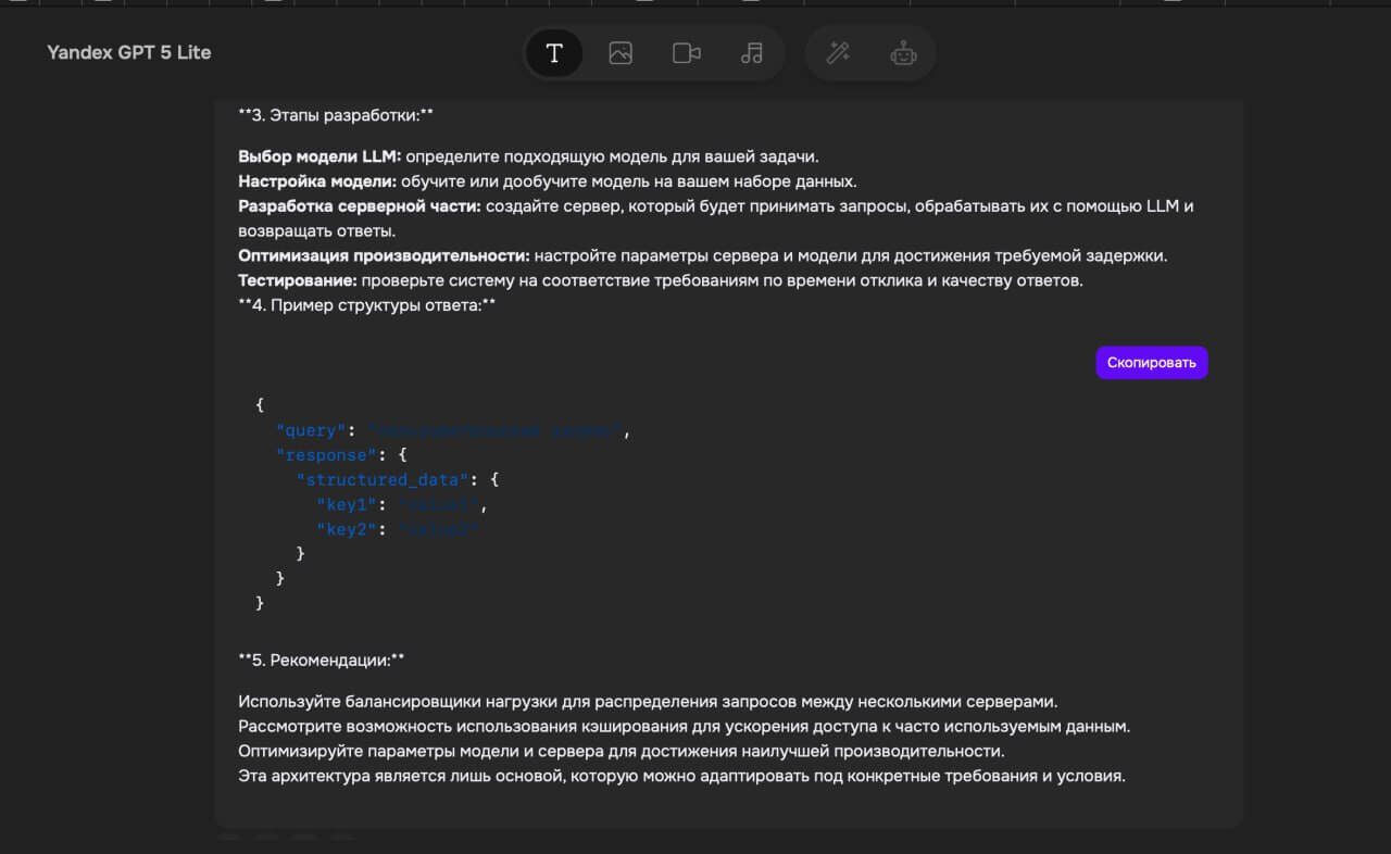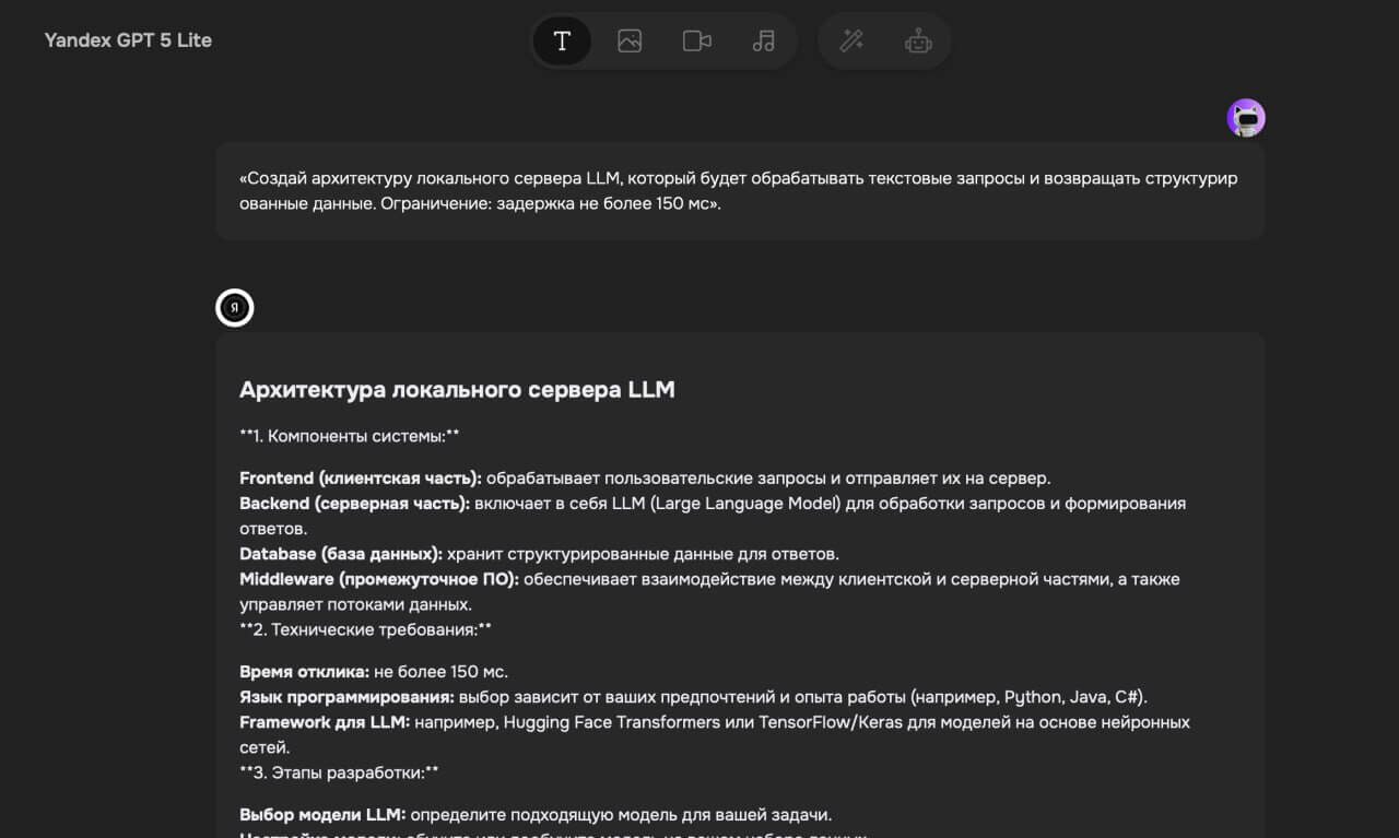 Промпт: «Создай архитектуру локального сервера LLM, который будет обрабатывать запросы и возвращать структурированные данные. Ограничение: задержка не более 150 мс».