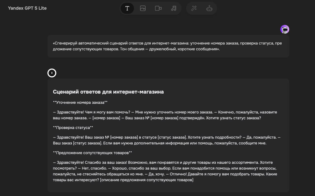 Промпт: «Сгенерируй автоматический сценарий ответов для интернет-магазина: уточнение номера заказа, проверка статуса, предложение сопутствующих товаров. Тон общения — дружелюбный, короткие сообщения».