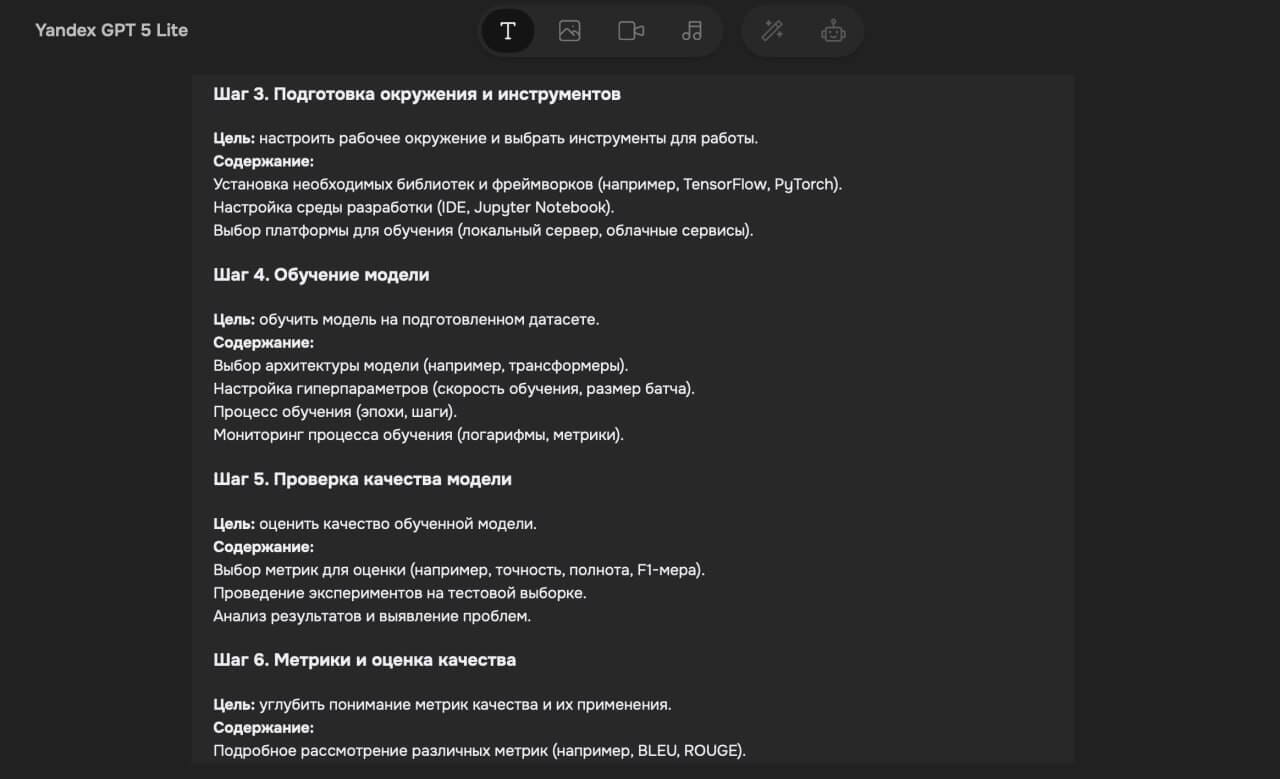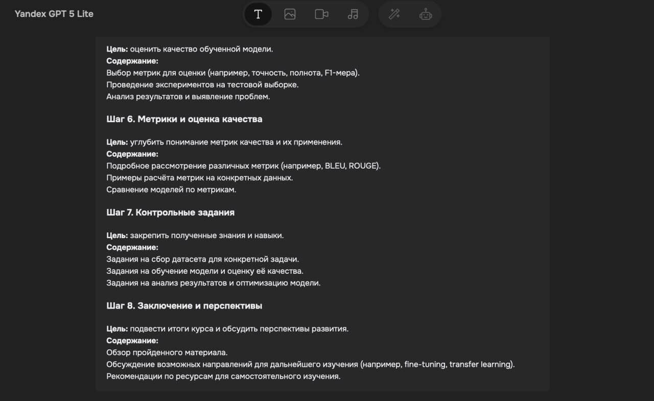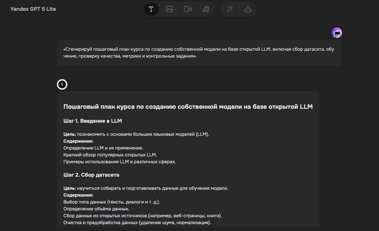 Промпт: «Сгенерируй пошаговый план курса по созданию собственной модели на базе открытой LLM. Надо включить сбор датасета, обучение, проверку качества, метрики и контрольные задания».