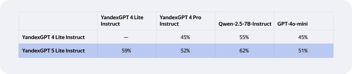 Таблица выше отражает слепые сравнения. Здесь пользователи выбирают лучший ответ, не зная названия модели. Такие тесты показывают не теоретическую, а практическую «“полезность»”. Lite-версия выигрывает у всех моделей в сравнении. В этот список входят Qwen-2.5–7B, GPT-4o-mini и обе версии Yandex GPT 4. Это говорит о более естественных, точных и надёжных ответах. Поэтому их проще читать и использовать в реальных задачах.