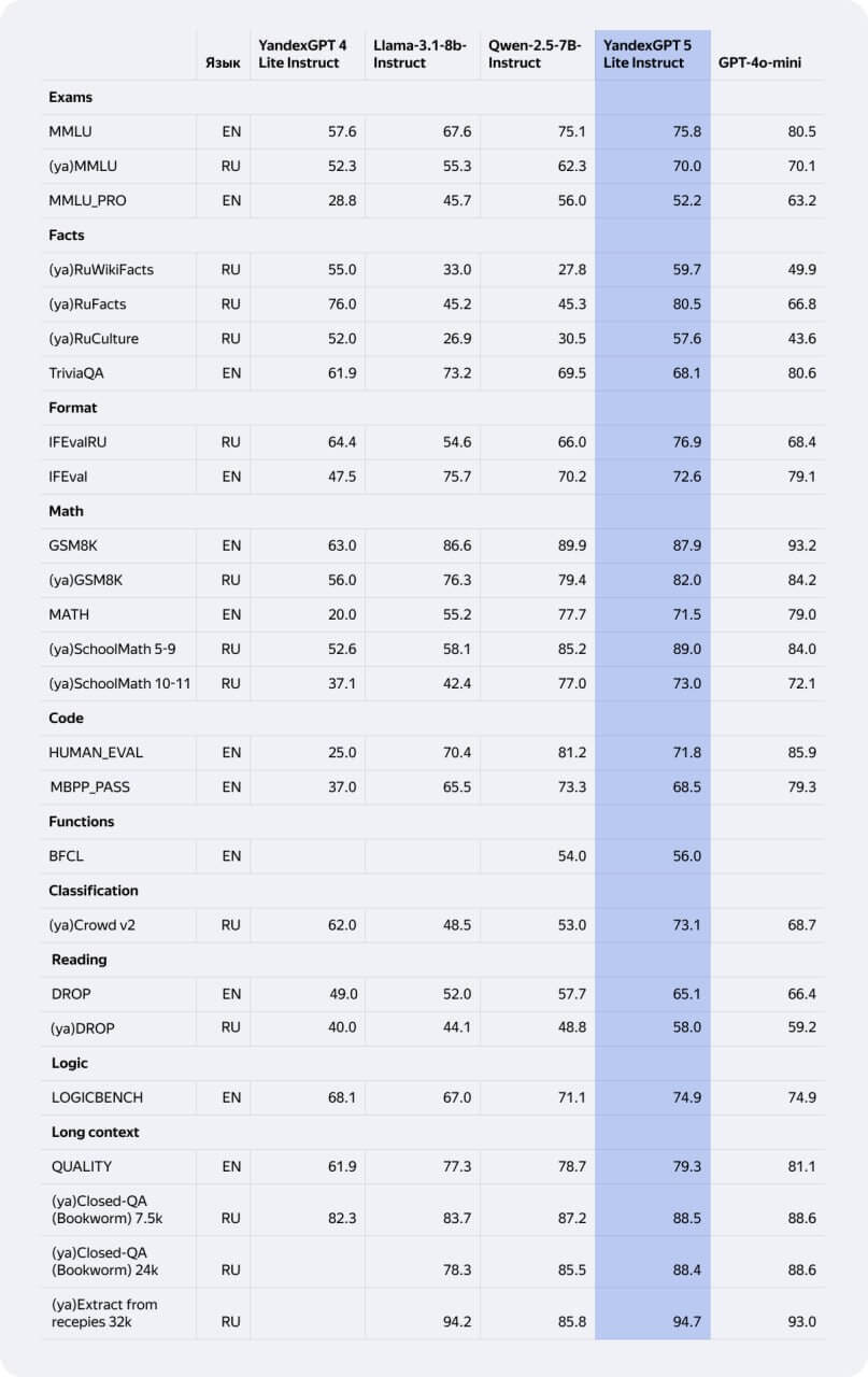 - Качество на русском: в тестах (MMLU, RuFacts) модель опережает китайскую Qwen2.5-7B-Instruct и сравнима с GPT-4o Mini в задачах сервисов Яндекса.