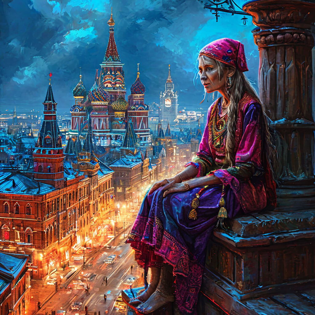 Промпт для модели: "Концептуальное изображение Бабы-Яги. Она сидит в над ночным городом. На заднем фоне виден Московский Кремль. Стиль: цифровая живопись, неоновое свечение, а также мрачная атмосфера."