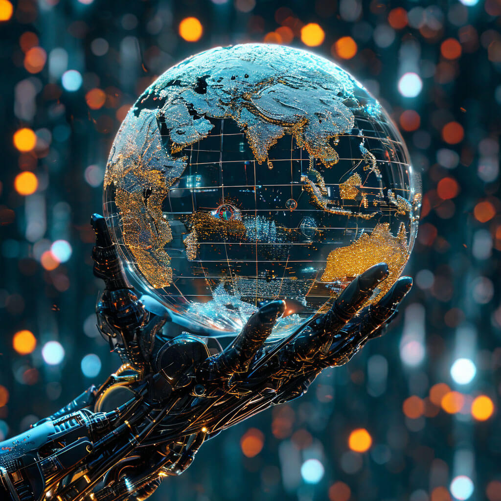 Промпт для модели: "Изображение кибернетической руки, которая держит светящийся голографический земной шар. Вокруг летают абстрактные данные. Фон: тёмный, минималистичный. Стиль — кинематографичный рендер, высокое разрешение 4K."