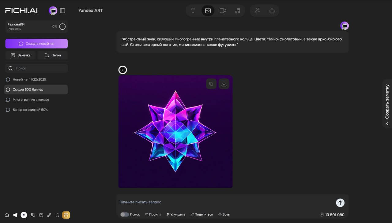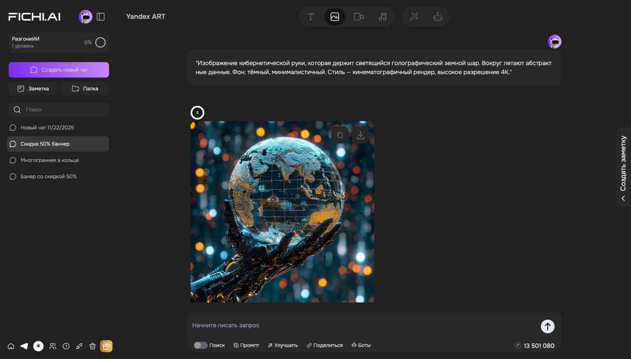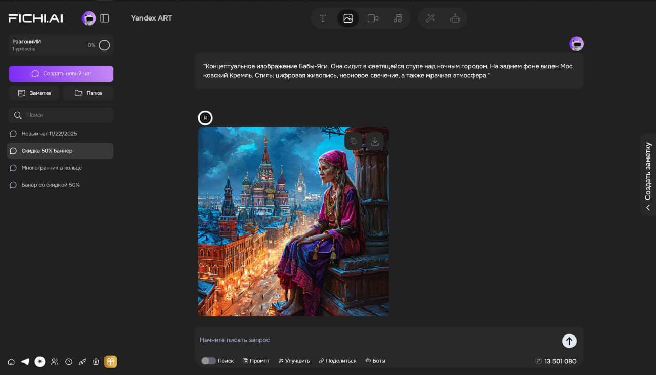 - Ориентированность на визуал: взаимодействие с моделью происходит через интуитивно понятный веб-интерфейс FICHI.AI. Система поддерживает сложные промпты. Вы управляете стилями и разрешением в один клик.