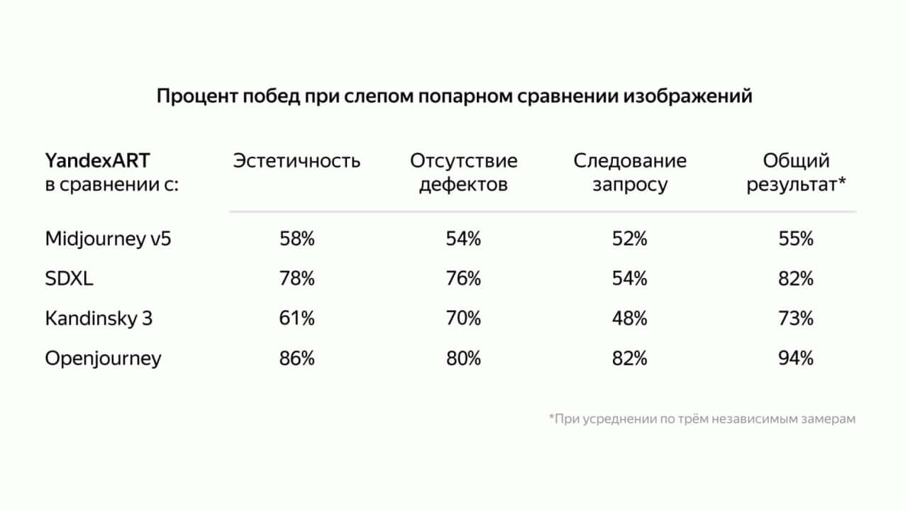 Проведённое тестирование подтверждает высокую конкурентоспособность YandexART. Нейросеть продемонстрировала превосходство над большинством популярных аналогов. Это касается как субъективной эстетической оценки, так и технического качества генерации.