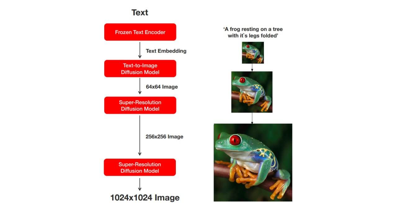 Изображение наглядно демонстрирует принцип работы каскадной диффузии. Этот подход лежал в основе ранних версий нейросети. Данная технология преобразует текстовый запрос в детальный визуальный контент.